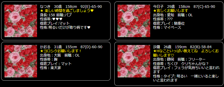 テクニックに関しては、マットプレイやキスが上手い嬢が多いので、ローションまみれのボディで絡み合いながら濃厚なベロチューをしたいと思っている方には非常におすすめですね。