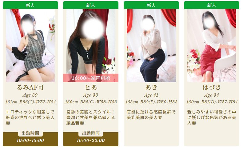 おすすめ分類の人妻さんの出勤が最も多く、こちらがいわゆるレギュラー出勤の人妻さんだと思います。
